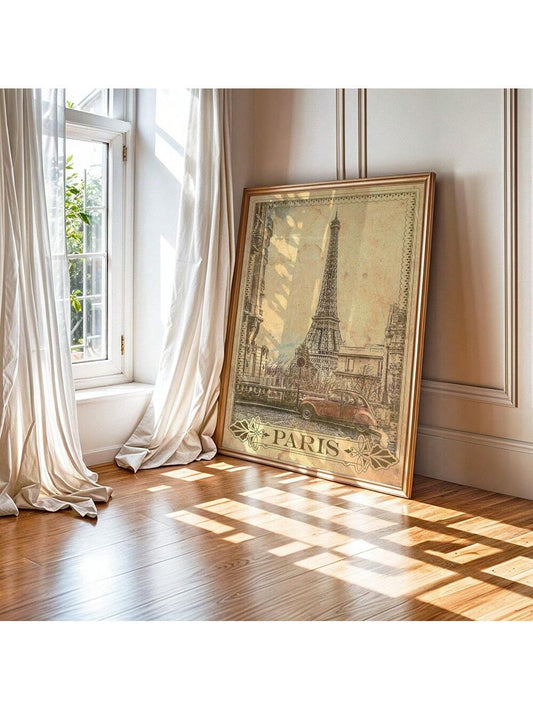 1 Pc Canvas Painting,Eiffel Tower, Framed Poster, Vintage Style, Paris, Armchair, Textured Wall, Terrazzo Floor,Wood Framed Painting (1) Thickness 2.5 Cm/ 1 Inch-Home Decoration For All Occasions,Ideal New Year, Valentine's Day,Thanksgiving,Easter,Christ