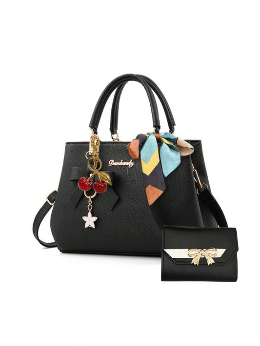 2pcs/Set Ladies' Solid Color Handbag And Card Holder With Pu Material And Bowknot Pendant,Valentine's Day Gifts Suitable For Daily Casual,Shopping,Business Commute,School Bag Set,Portable,Classic Casual,Business Casual,For Teen Girls Women College Studen