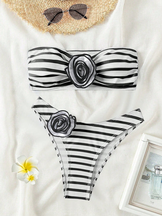 Swim Conjunto de Bikini de faixa aleatória com decoração de flores 3D para Praia de Verão, Festival de Música
