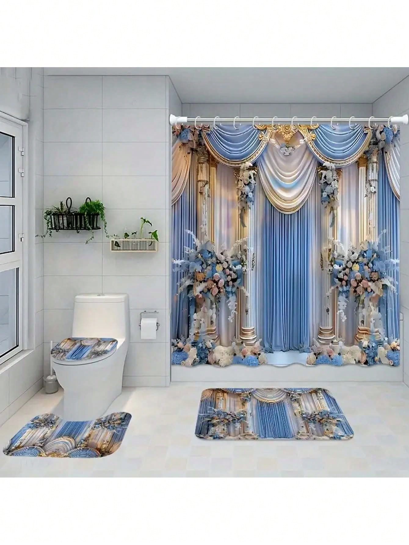 1/4pcs Waterproof Shower Curtain Set With 12 Hooks, Bathroom Rug, Non-Slip Bathmat, Washable Polyester Fabric, Bath Room Accessories, Women Valentine Gift Birthday Boyfriend Girlfriend Home Bathroom Decor Summer