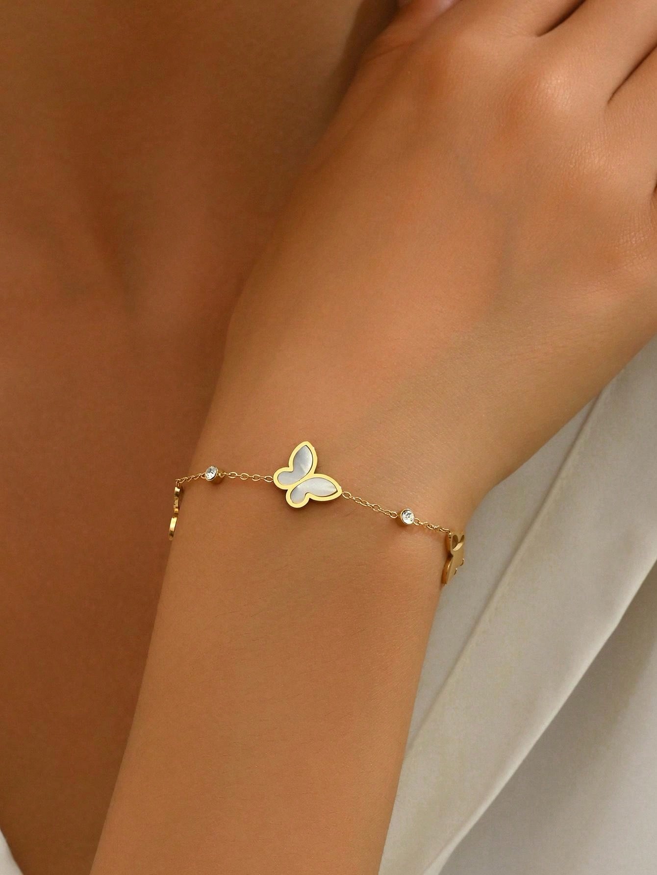 1 pièce Bracelet en acier inoxydable incrusté d'un papillon en coquille blanche à strass pour femmes, accessoire élégant et doux pour les célébrations et festivals