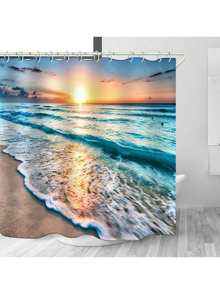 1pc Vibrant Beach Sunrise Sunset Shower Curtain - Waterproof Bathroom Accessories With Hooks - Decorative Bathroom Divider And Bathroom Decor Summer