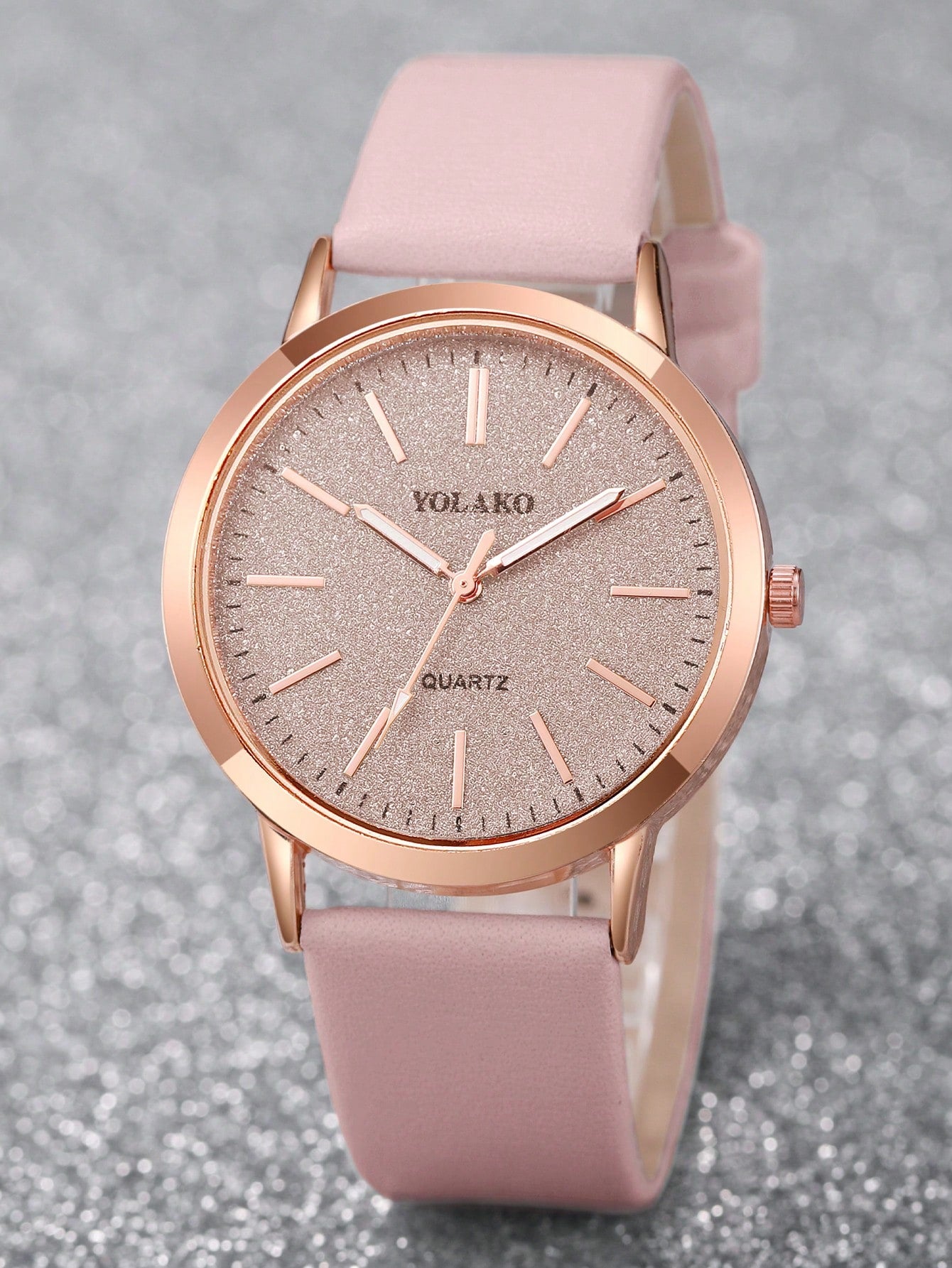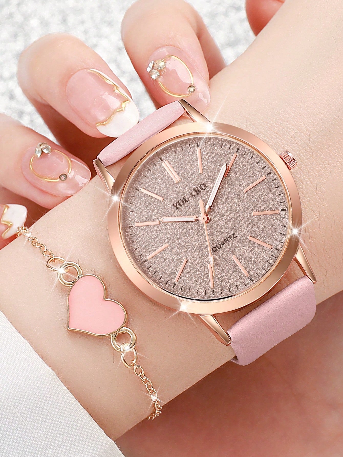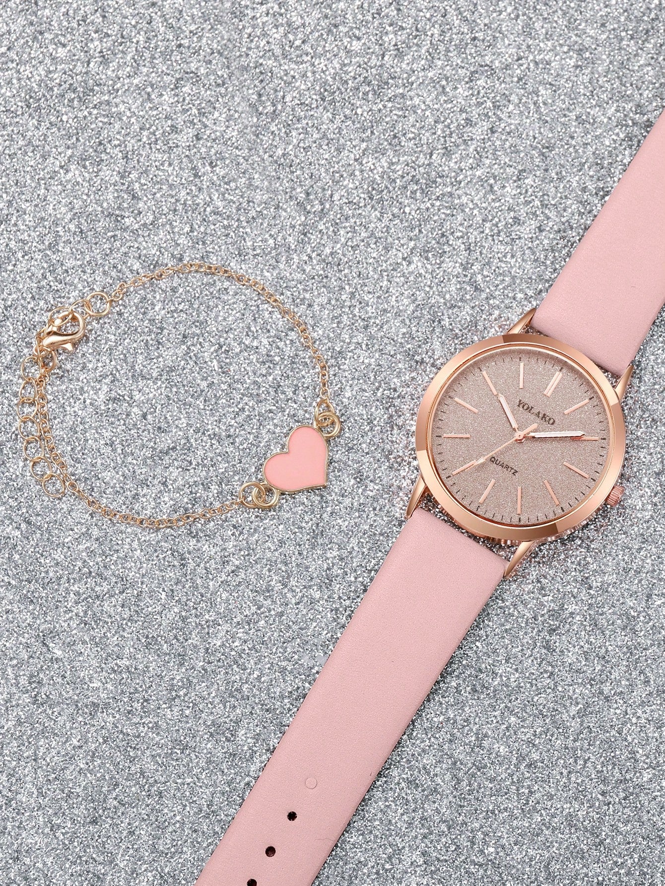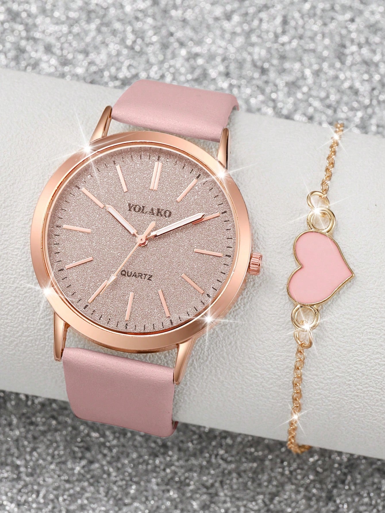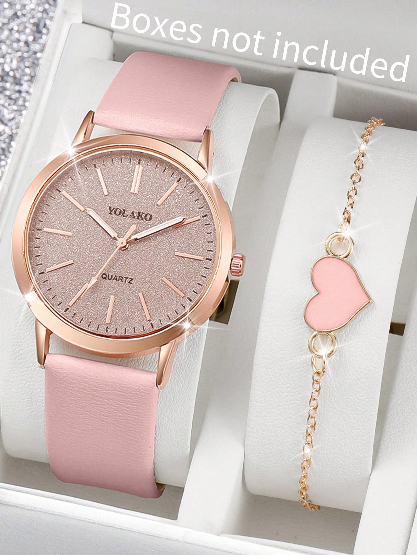 2pcs/Set Women Casual Faux Leather Quartz Watch With Engraved Dial & Heart Chain Bracelet