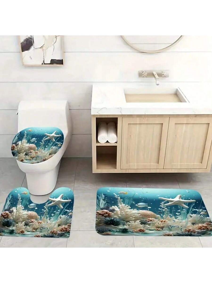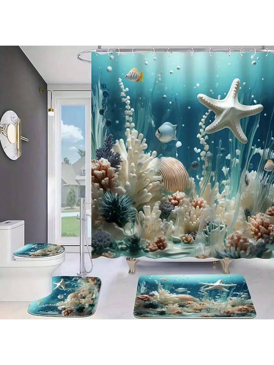 4pcs/Set Starfish Bathroom Shower Curtain Set, Includes Waterproof Curtain, Non-Slip Mat, Toilet Lid Cover, Bath Mat And 12 Plastic Hooks, Bathroom Accessories And Home Decor Home Bathroom Decor Summer