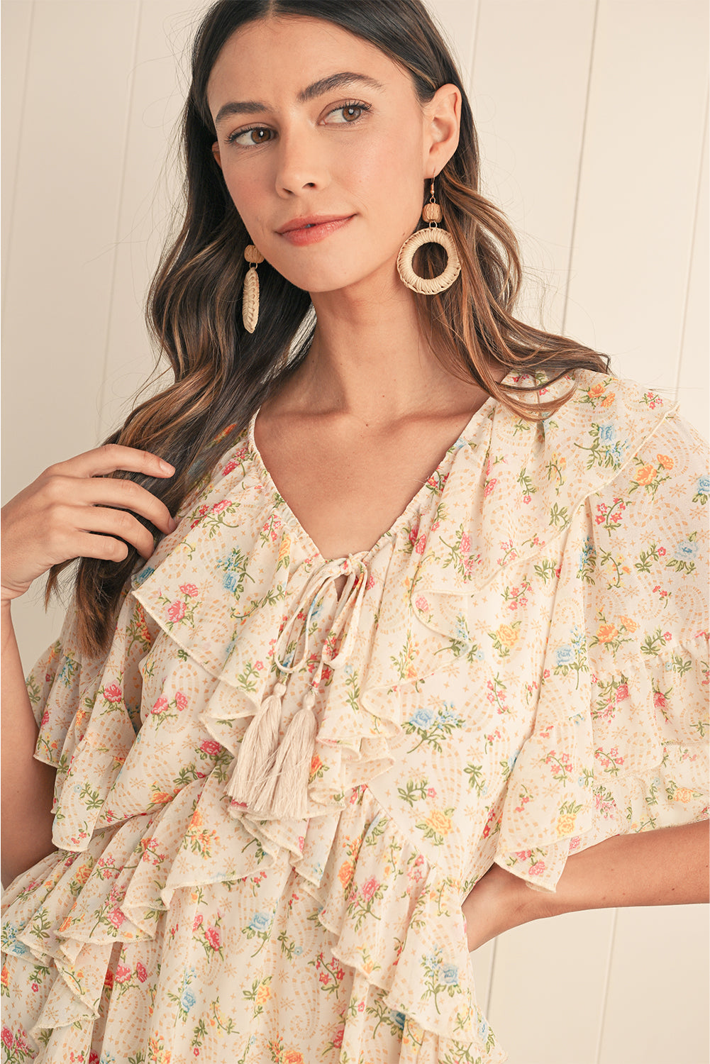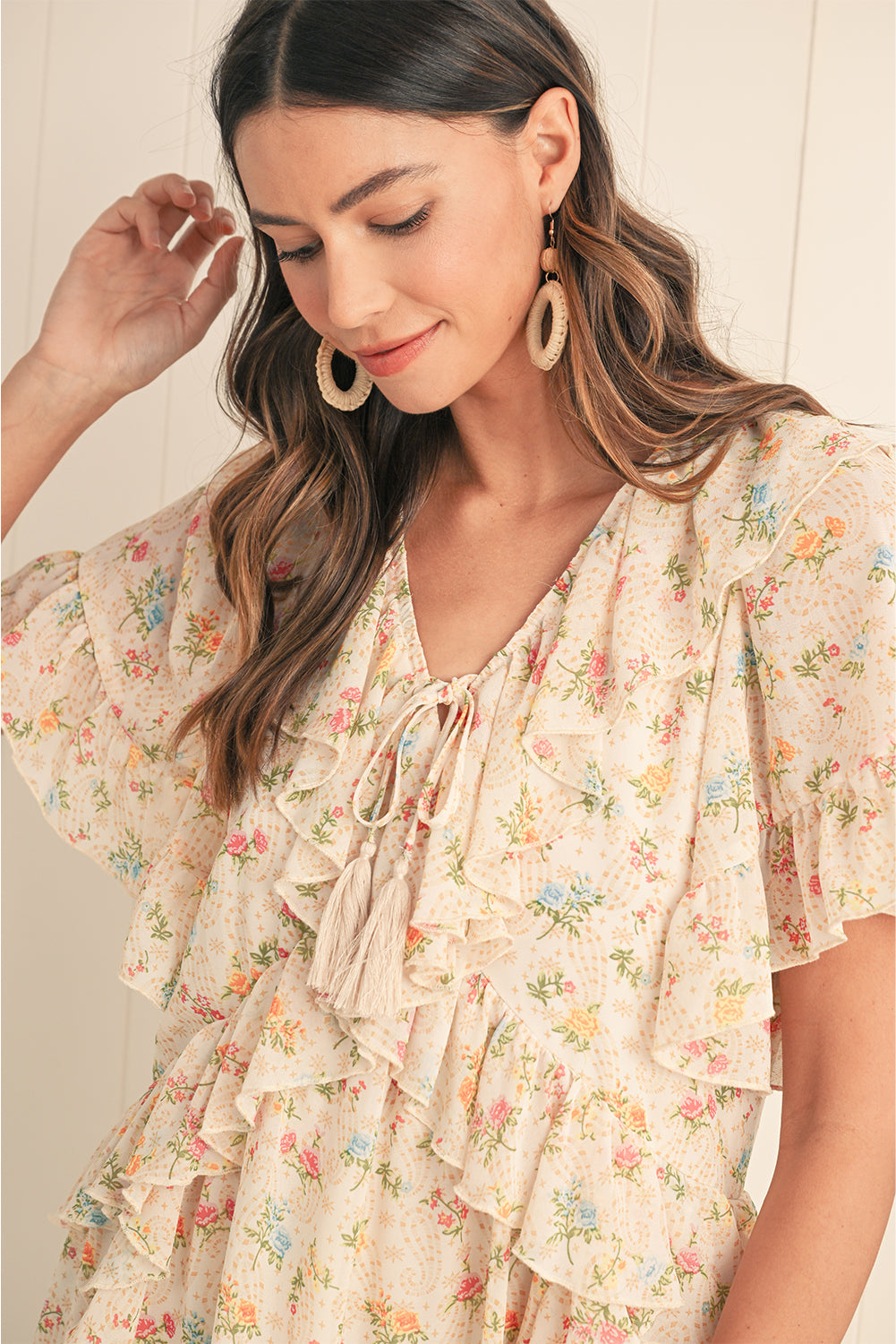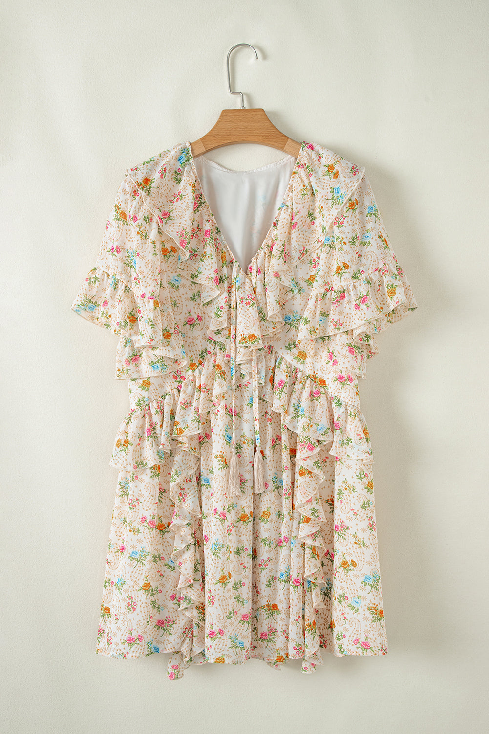 Apricot Boho V Neck Floral Tassel Tie Ruffle Mini Dress