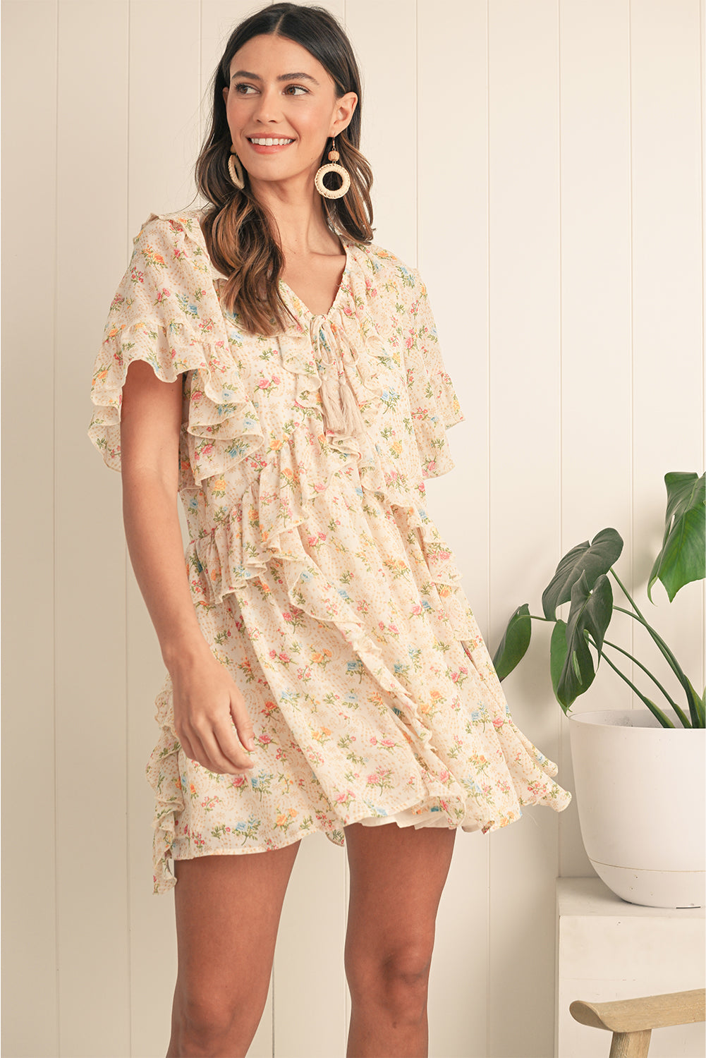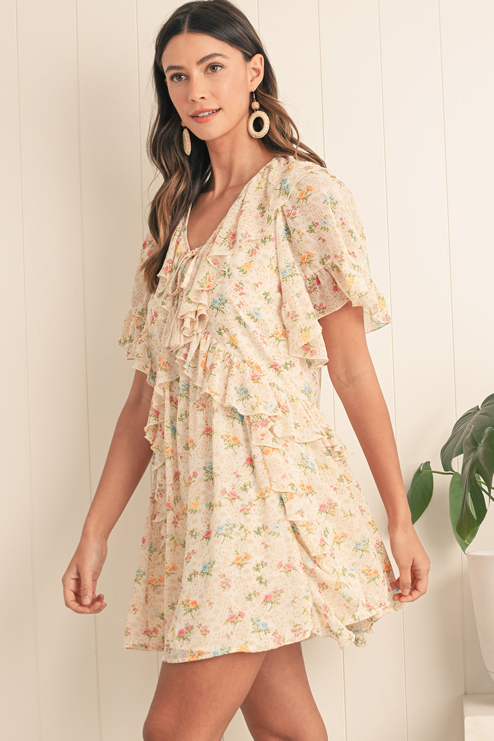- Embrace boho vibes with this apricot mini dress featuring a floral print and ruffle details.