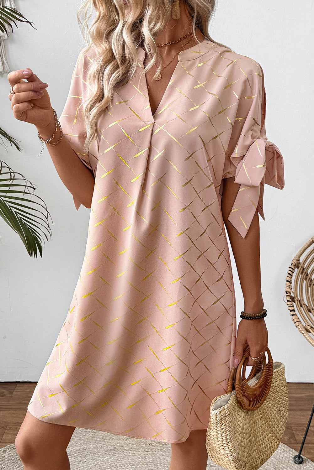Apricot Pink Geometric Print Knot Sleeve V Neck Mini Dress