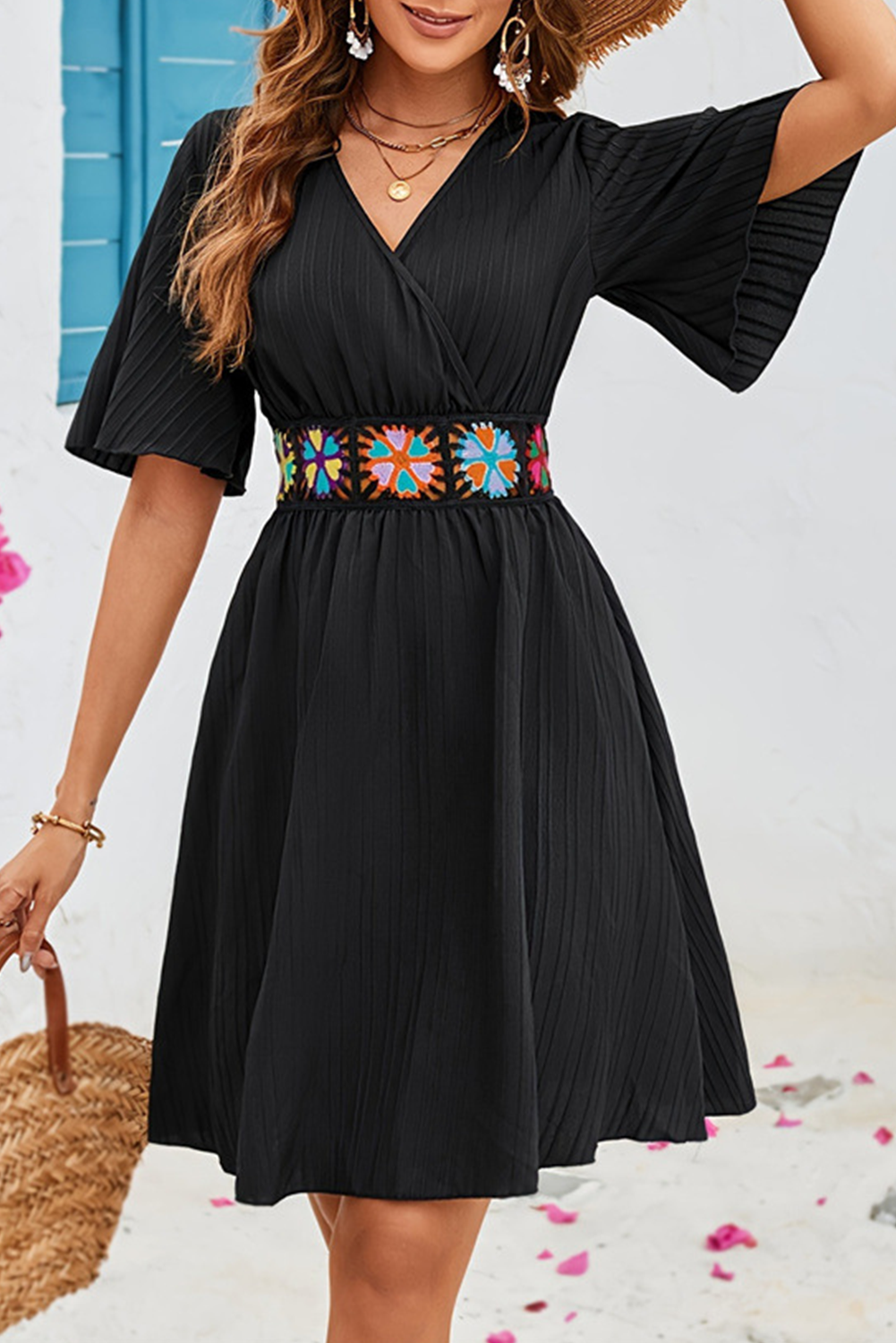 Black Floral Embroidered Belt Flutter Sleeve V Neck A Line Dress