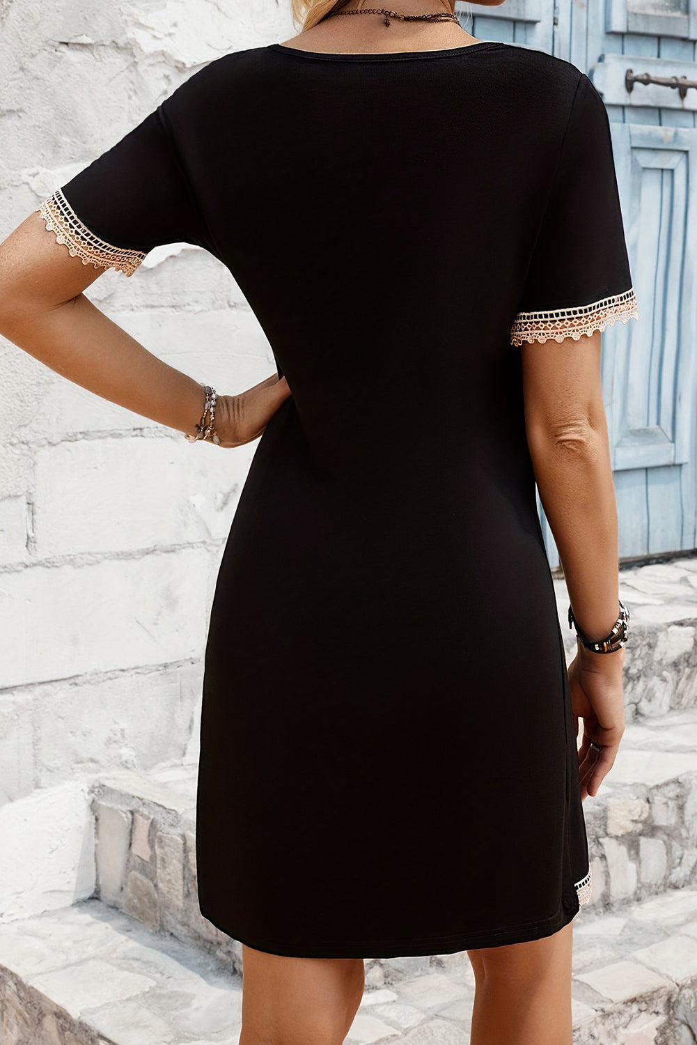 Black Lace Trim V Neck Short Sleeve Mini Dress