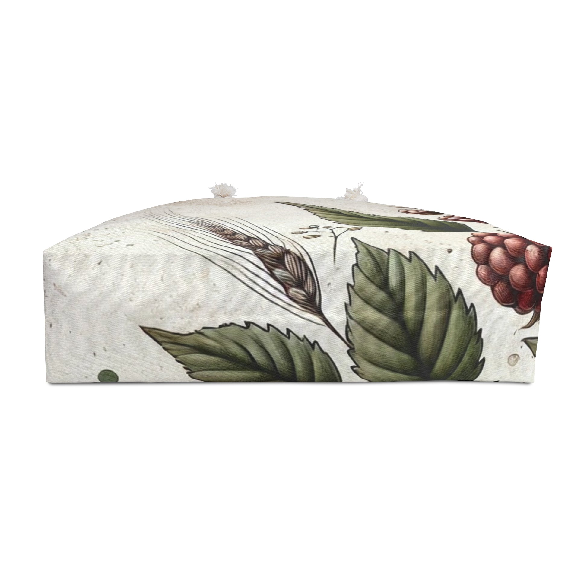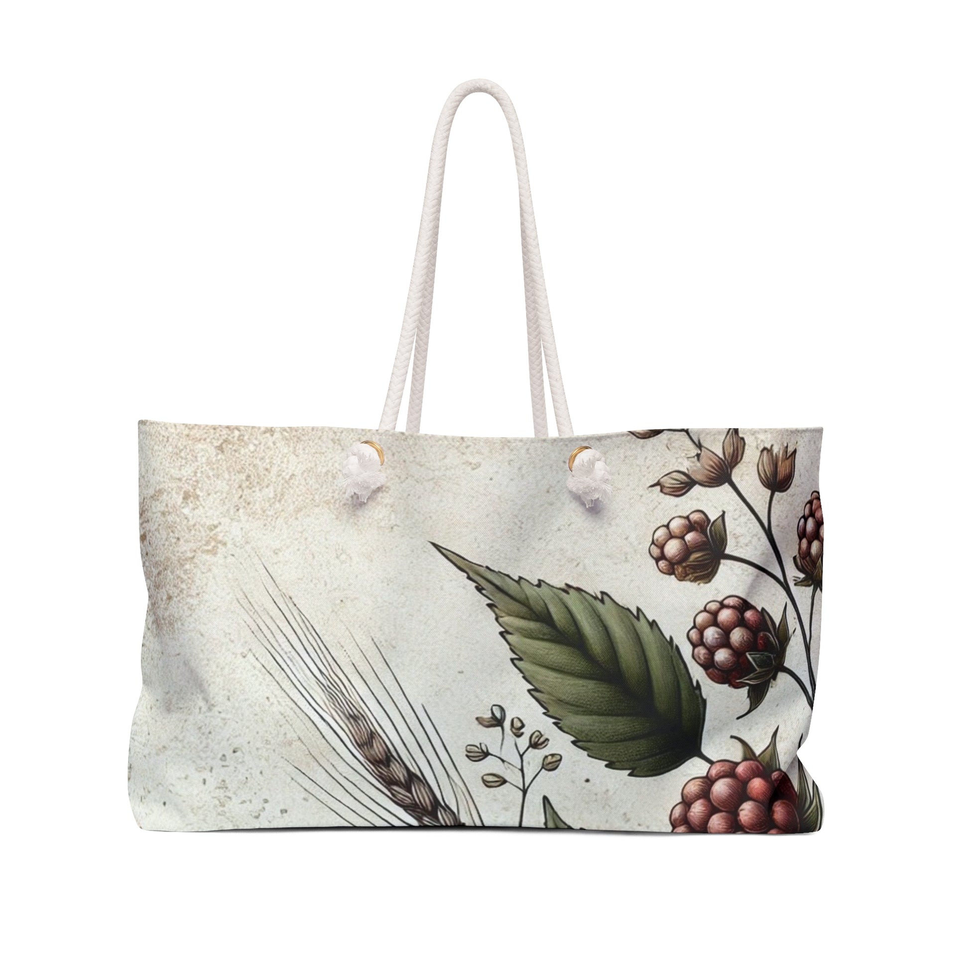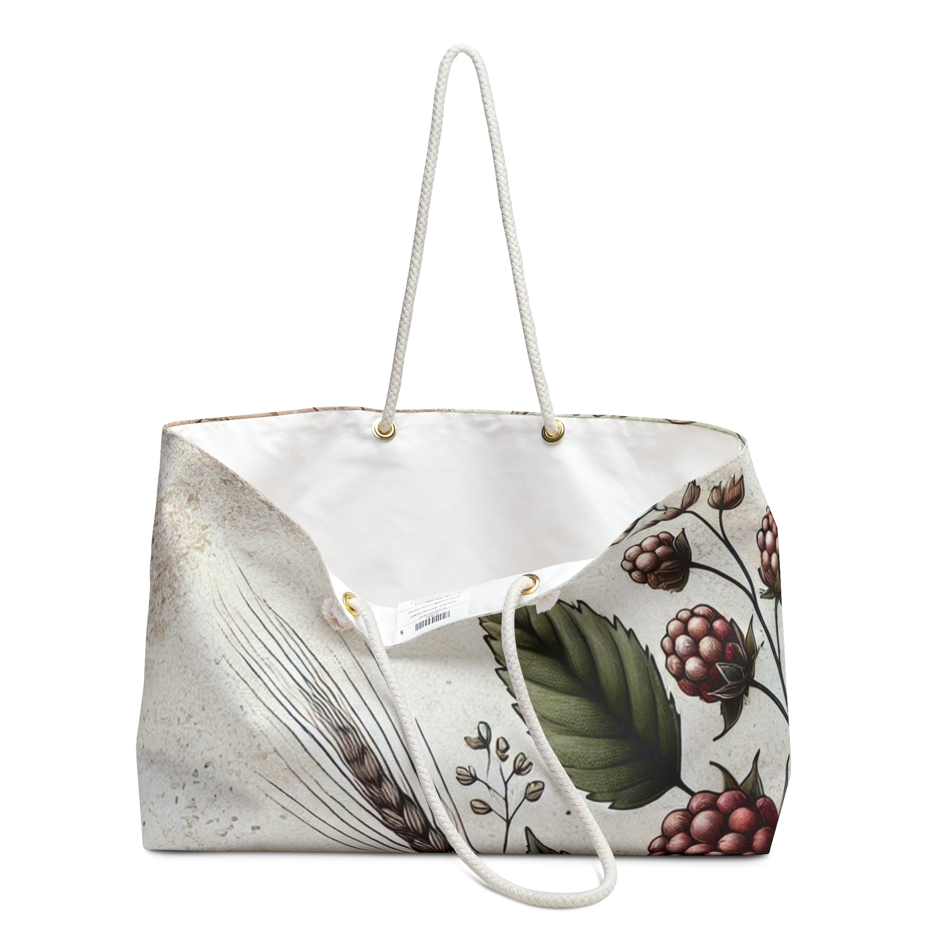 PrairieSpirits Boho beach bag with blackberries design. Perfect for a weekend getaway or a day at the beach. Gives off a relaxed and bohemian vibe. Ideal for those who love nature-inspired prints and enjoy outdoor activities. Great for summer vacations, beach trips, and music festivals.