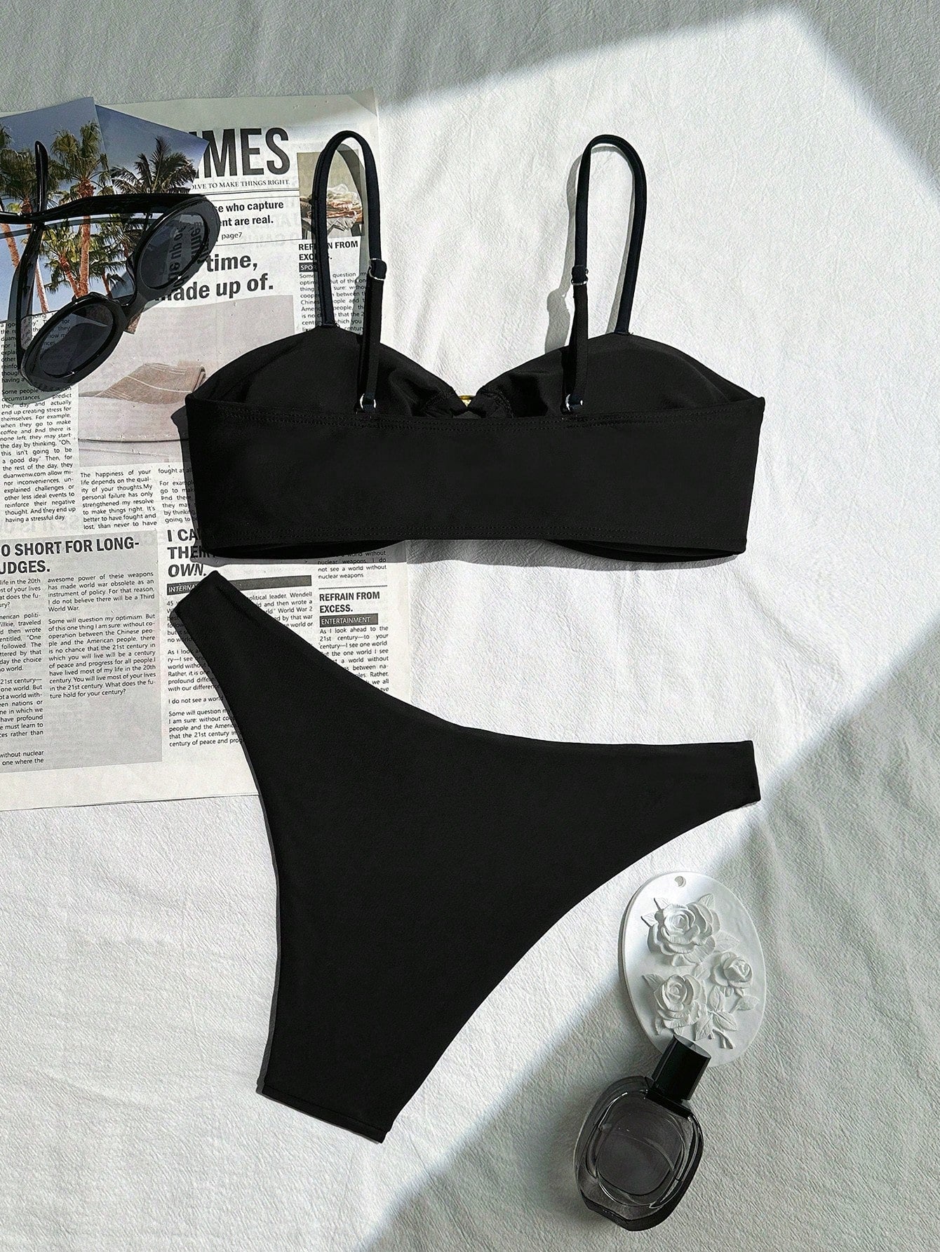 Conjunto de Maiô Bikini feminino preto apertado e sensual para o verão, estilo casual de praia, com alças finas e ajustáveis
