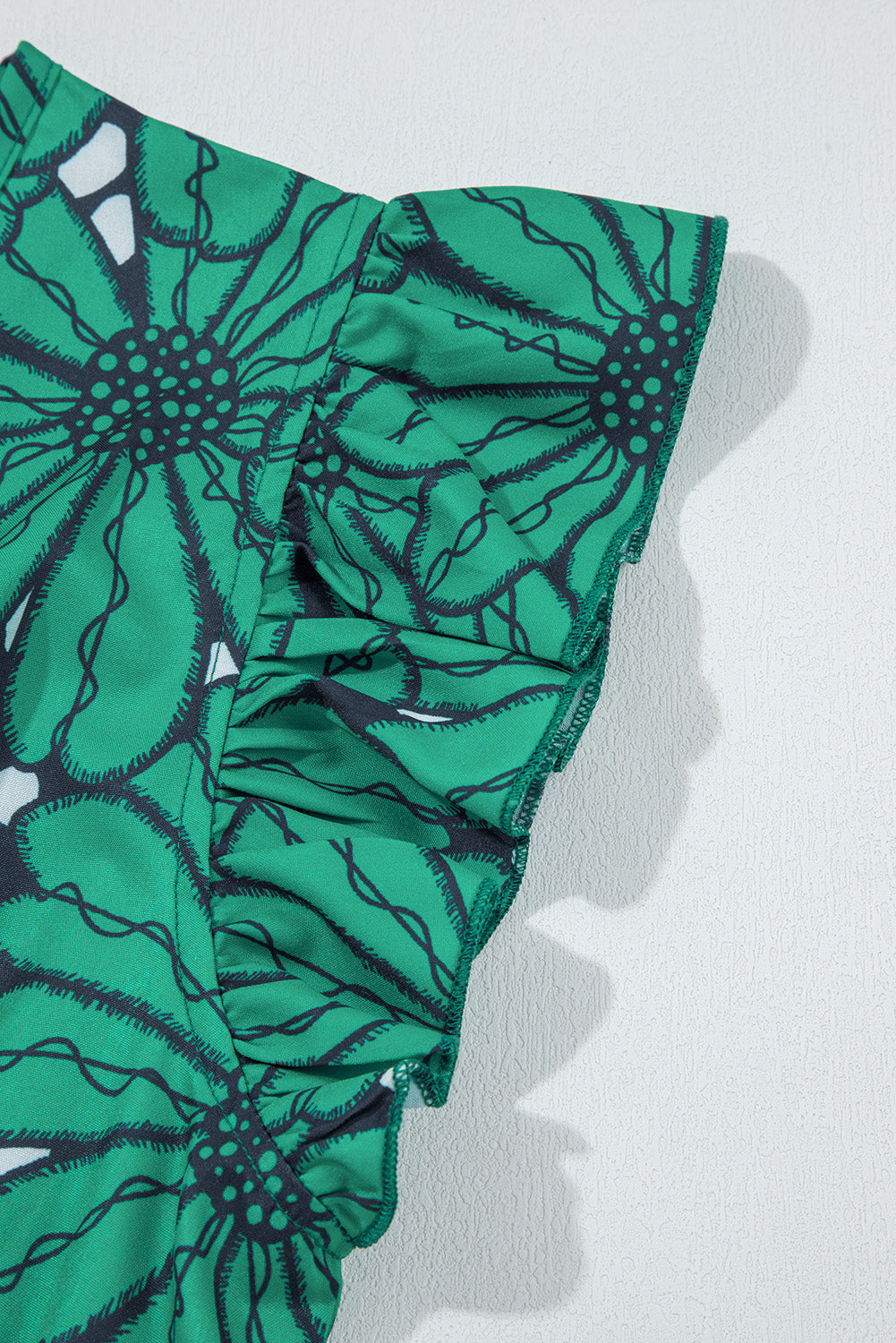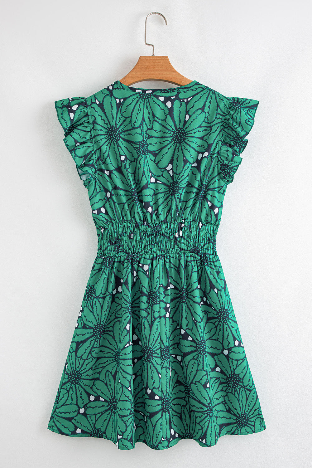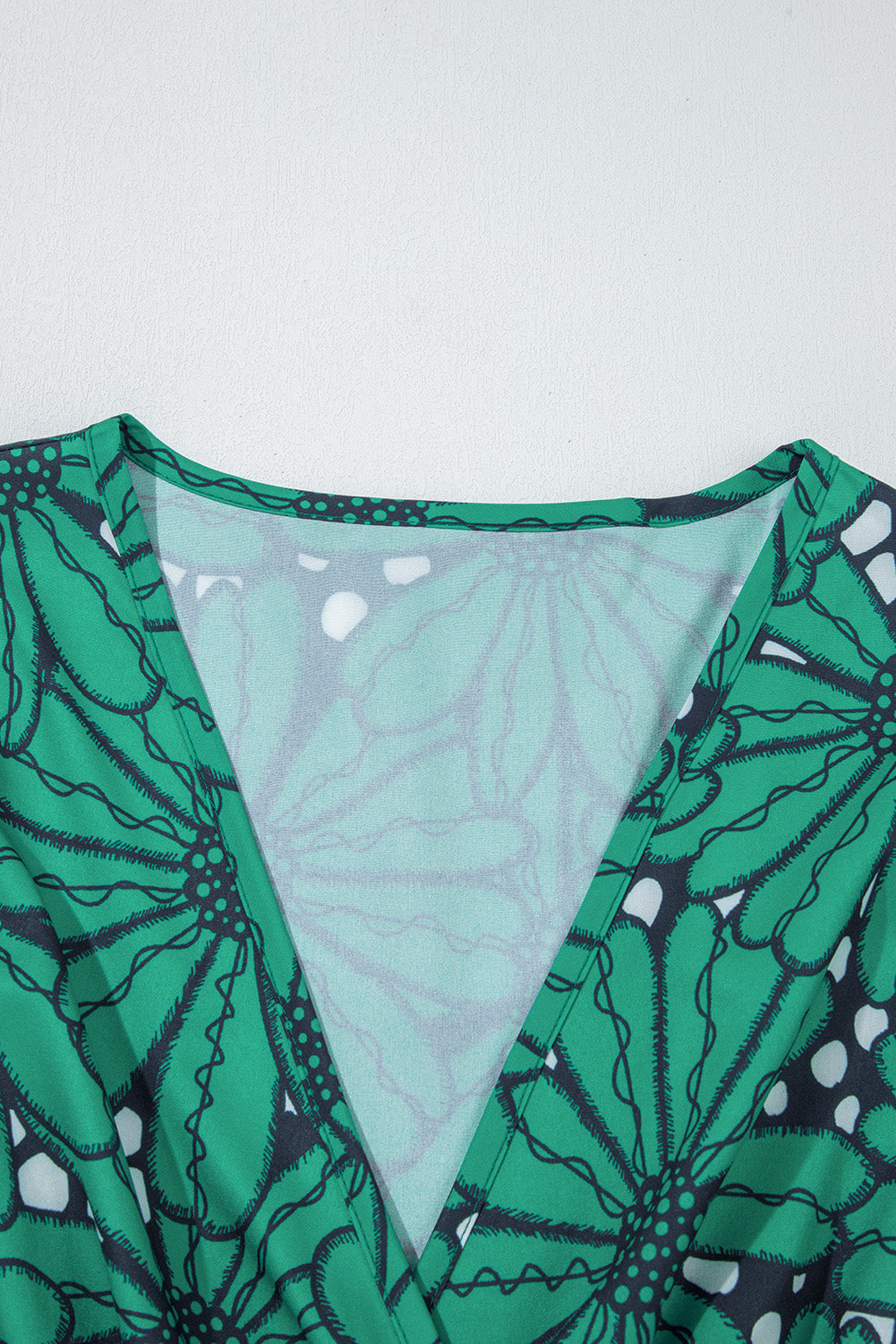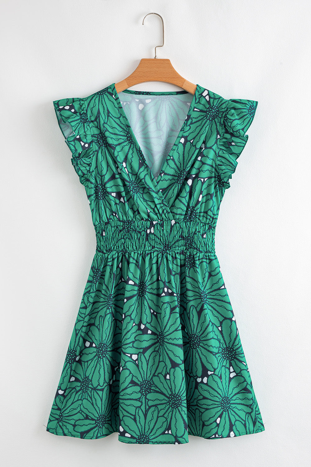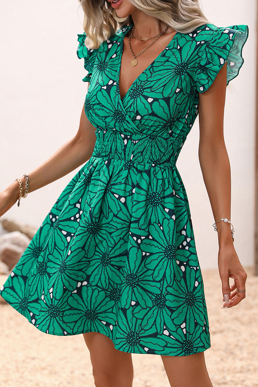 Dark Green Wrapped V Neck Floral Print Ruffle Sleeve Dress