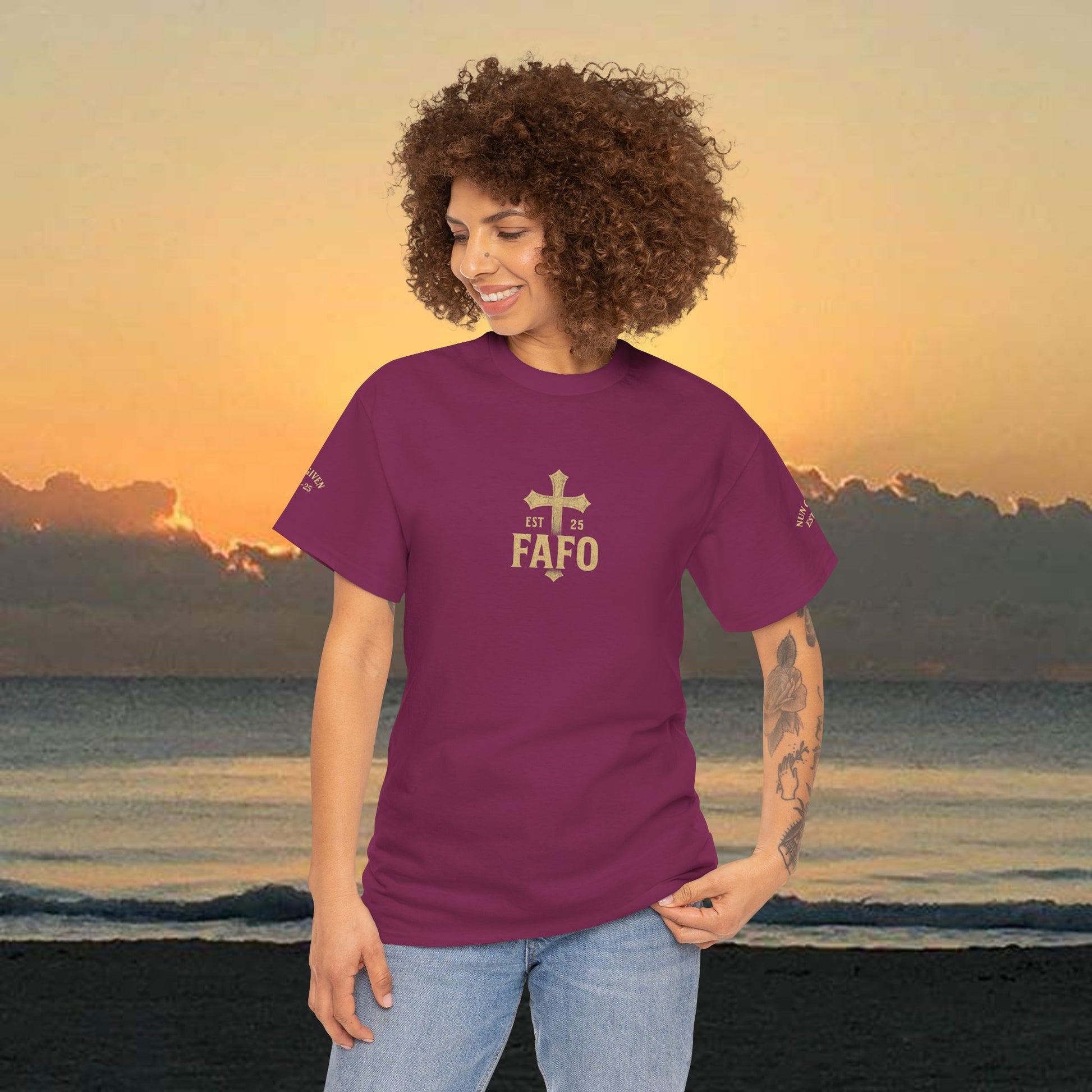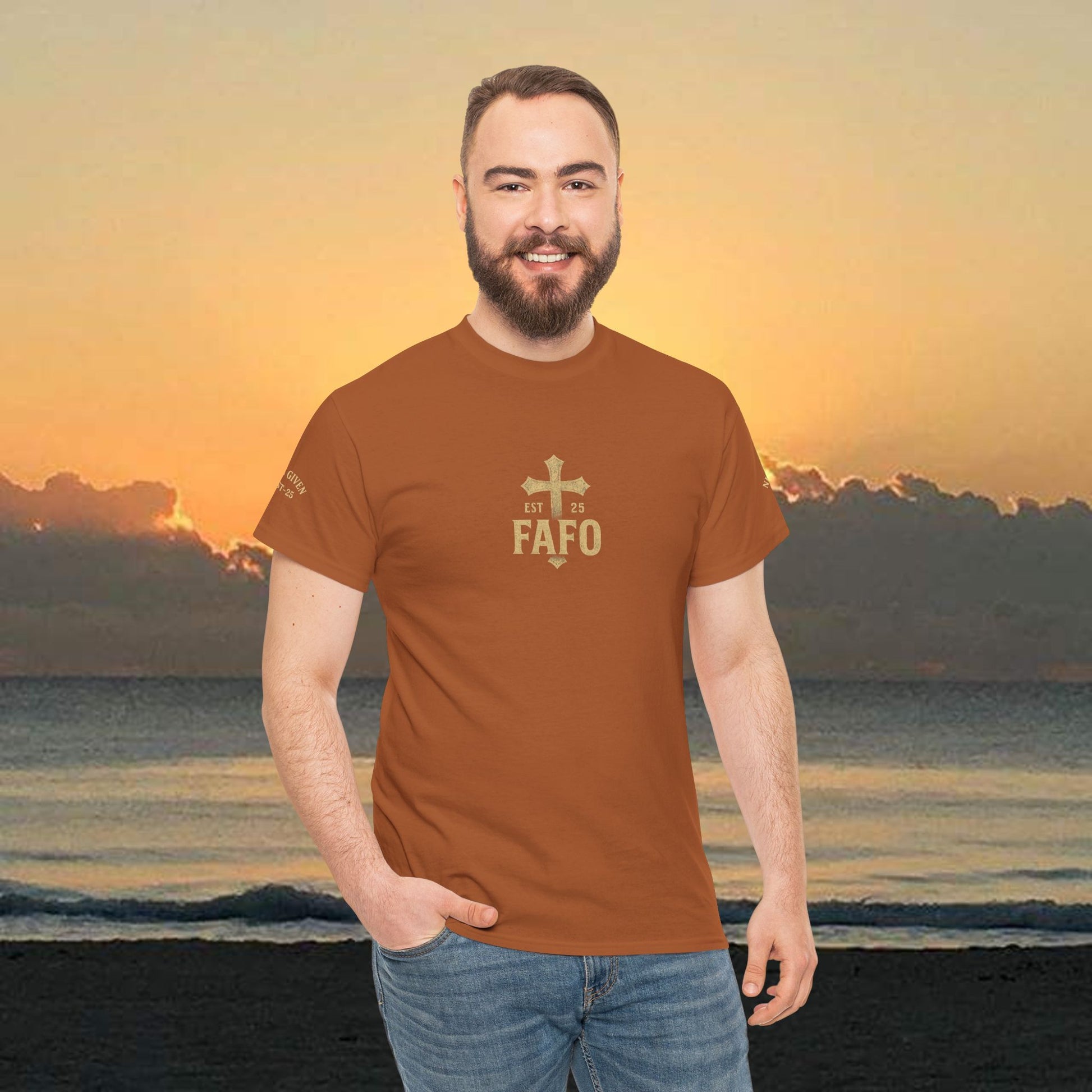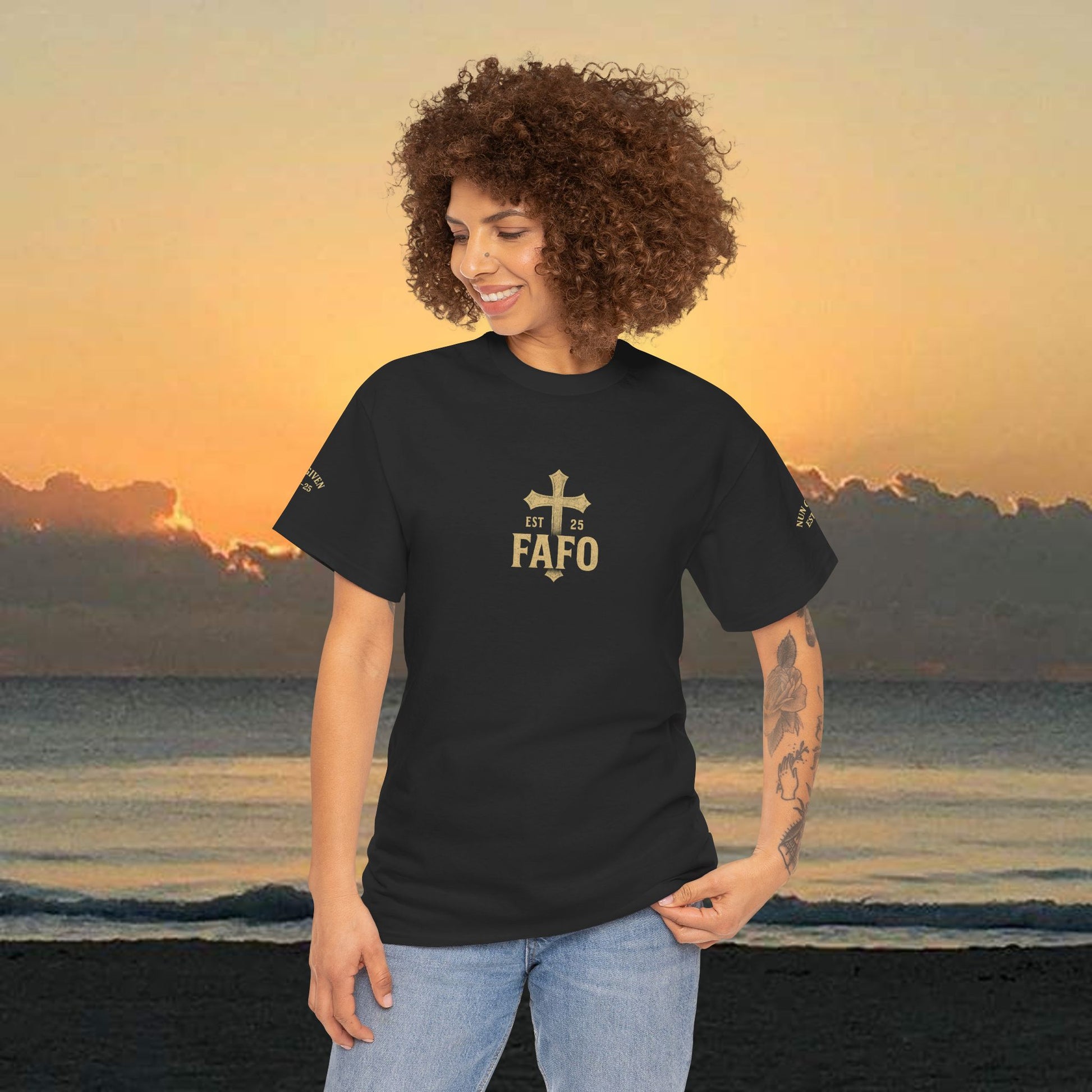 The Tee from FAFO GenX Style - PrairieSpirits Designers Collection exudes a modern and edgy vibe, perfect for the fashion-forward individual. This unisex heavy cotton tee is ideal for those looking for comfortable, durable, and stylish everyday wear. It is relevant for fashion enthusiasts, trendsetters, and those looking to make a statement. Suitable for casual outings, social events, and street style looks.