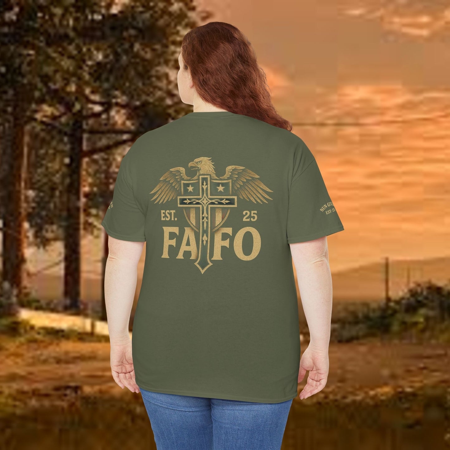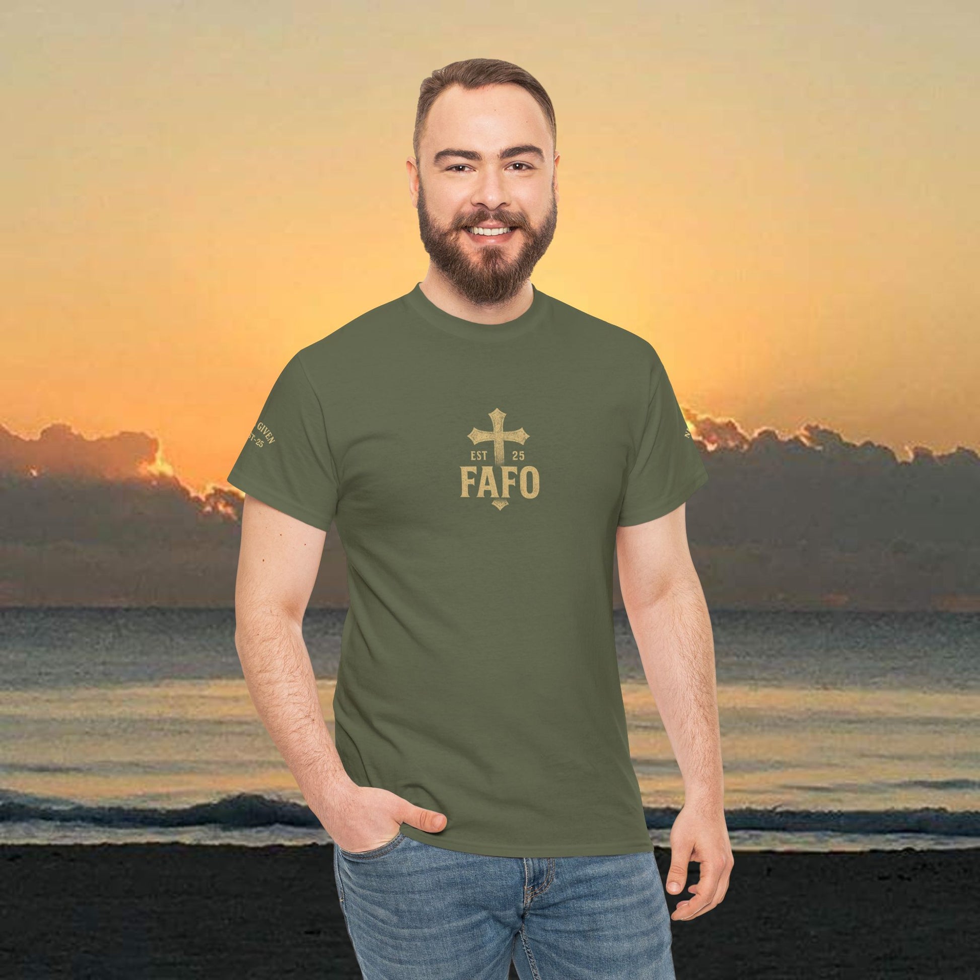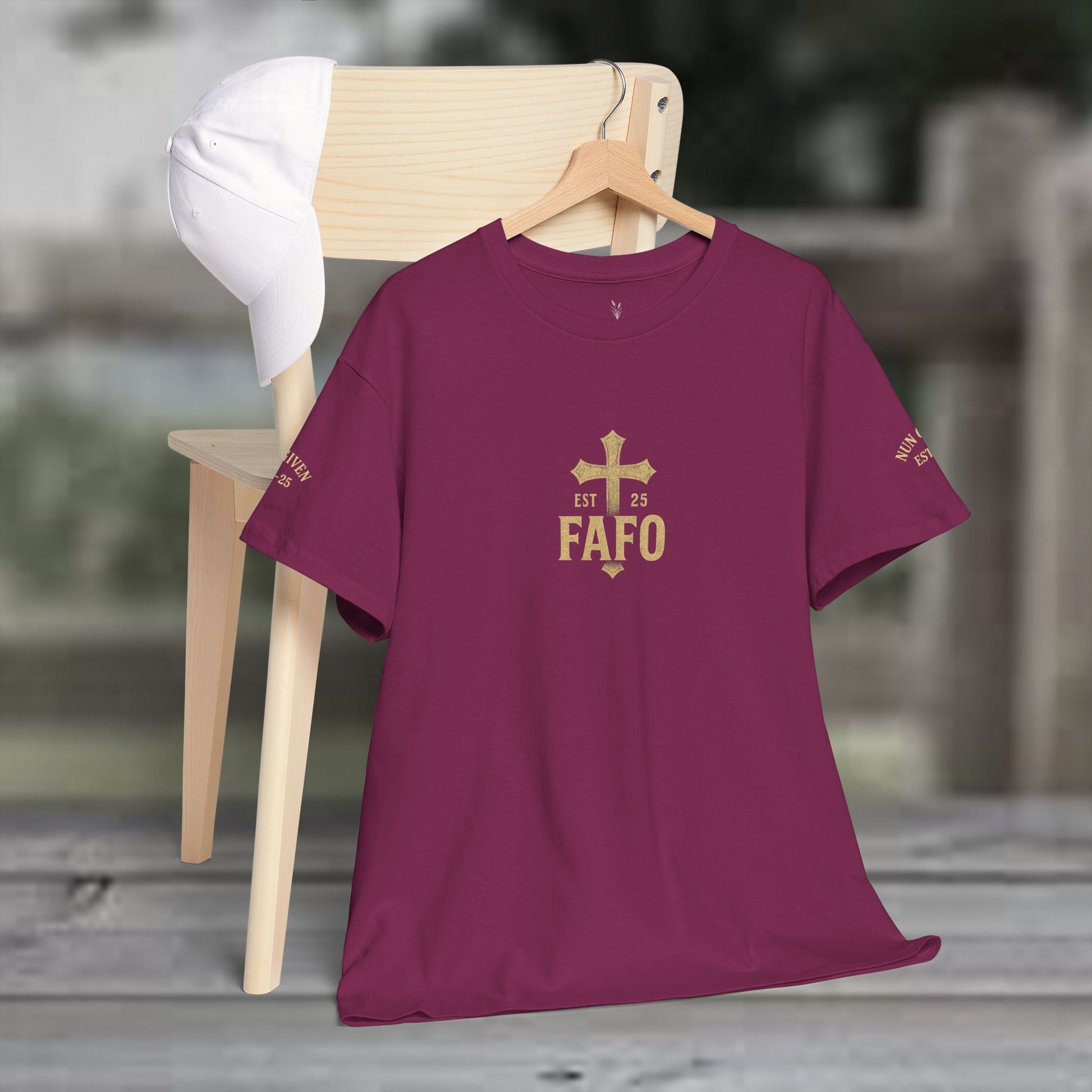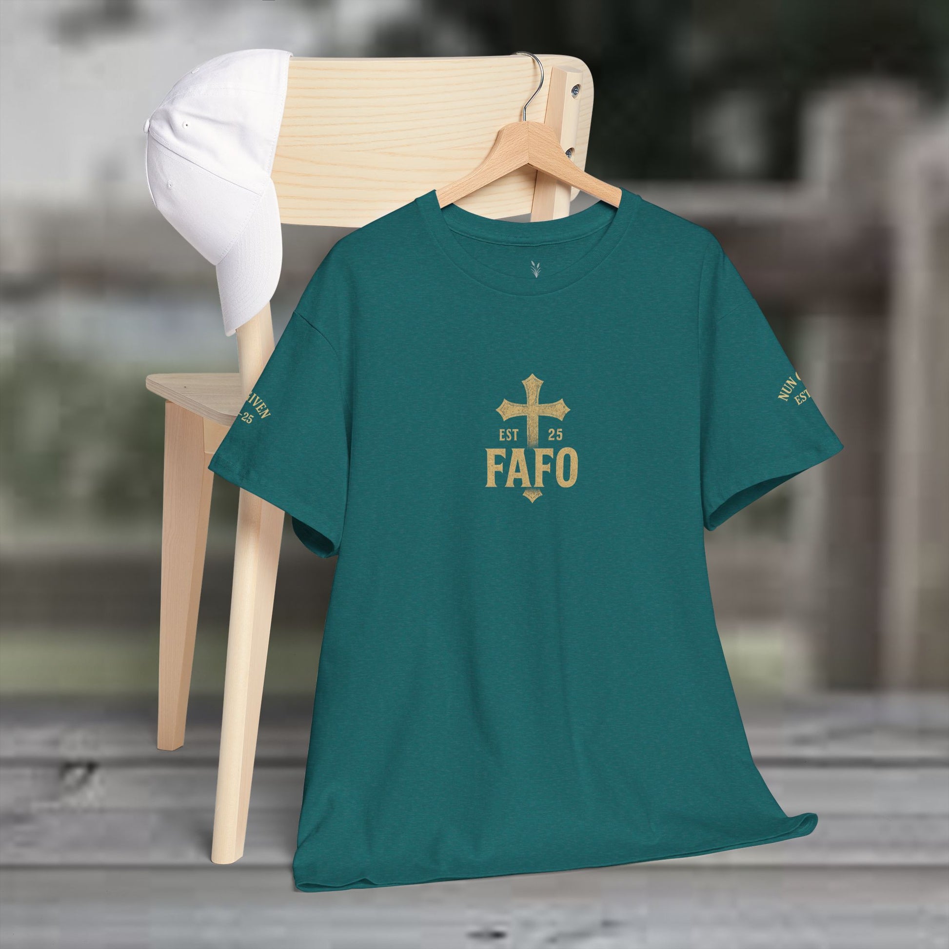 The Tee from FAFO GenX Style - PrairieSpirits Designers Collection exudes a modern and edgy vibe, perfect for the fashion-forward individual. This unisex heavy cotton tee is ideal for those looking for comfortable, durable, and stylish everyday wear. It is relevant for fashion enthusiasts, trendsetters, and those looking to make a statement. Suitable for casual outings, social events, and street style looks.