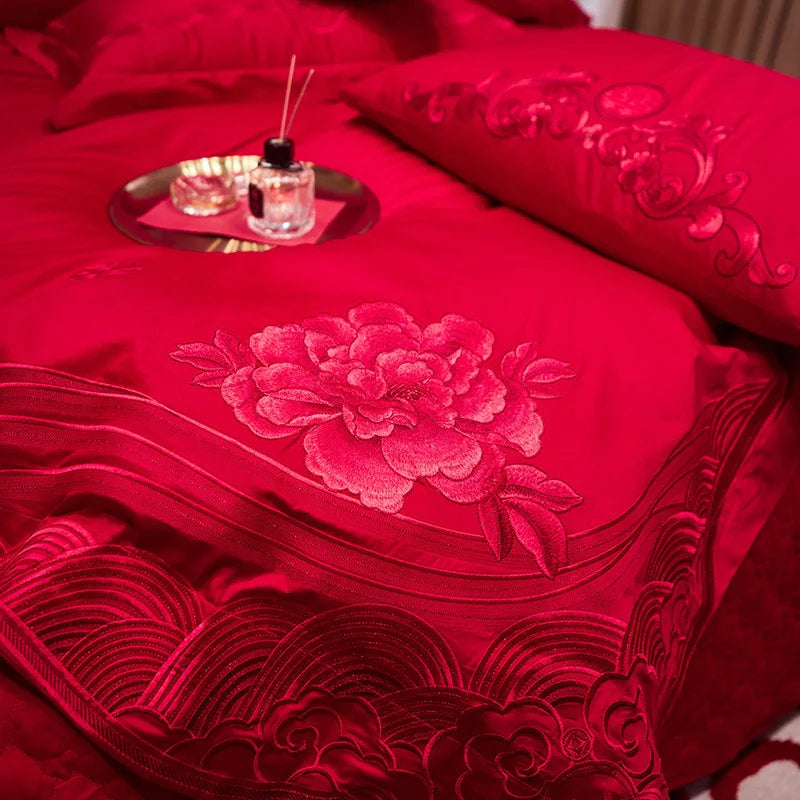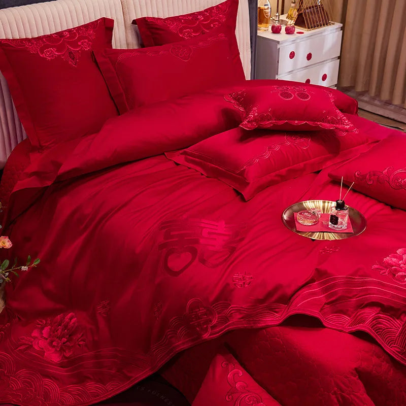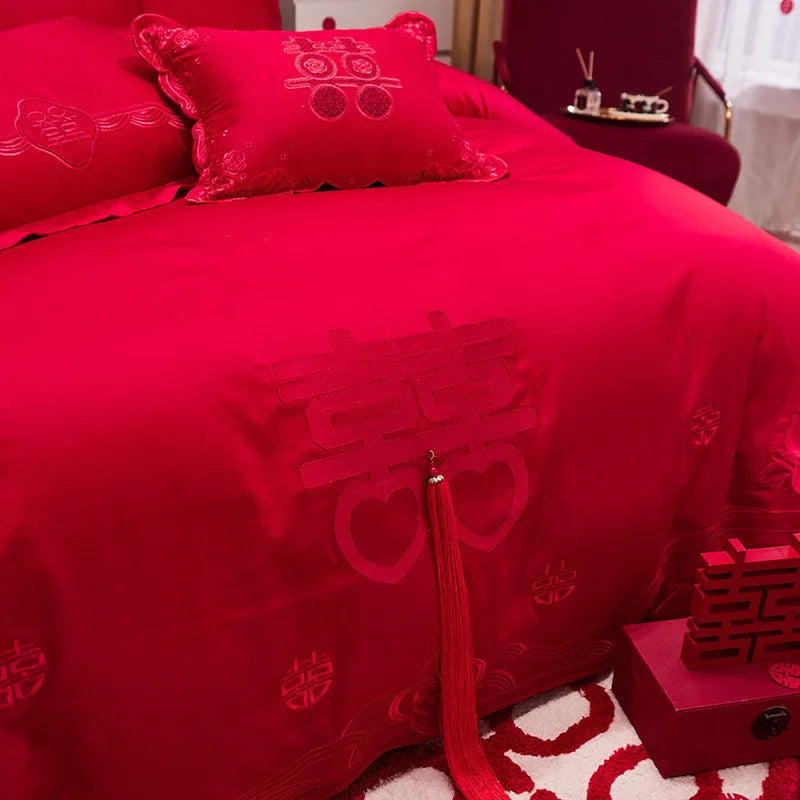 Golden Tassels Flowers Embroidery Bedding Sets Luxury Chinese Wedding Red 100% Cotton Duvet Cover Bed Sheet Pillowcases 4/6pcs