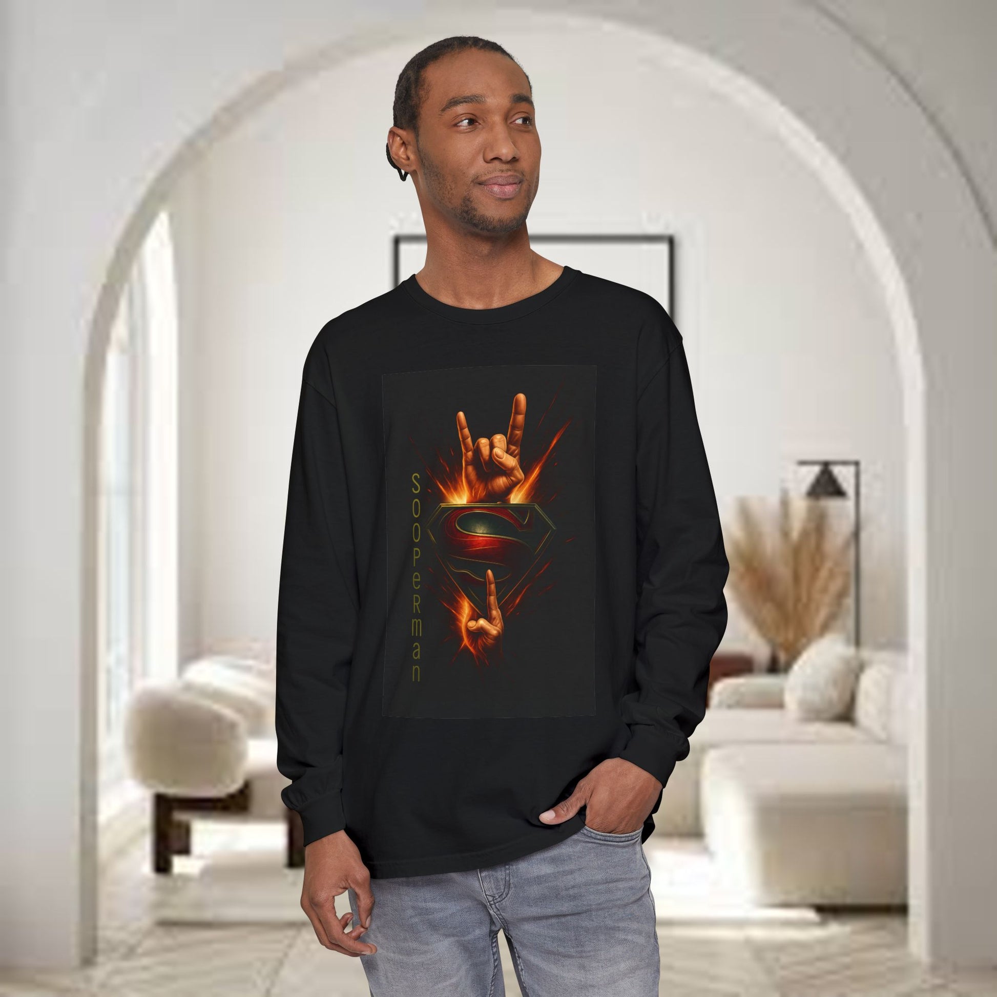 S0operman Long Sleeve T-Shirt by PrairieSpirits gives off a fun and adventurous vibe, perfect for comic book enthusiasts and superhero fans. This garment-dyed long sleeve t-shirt is ideal for casual wear and can be a great addition to your wardrobe during comic book conventions, Halloween, or casual Fridays at the office.