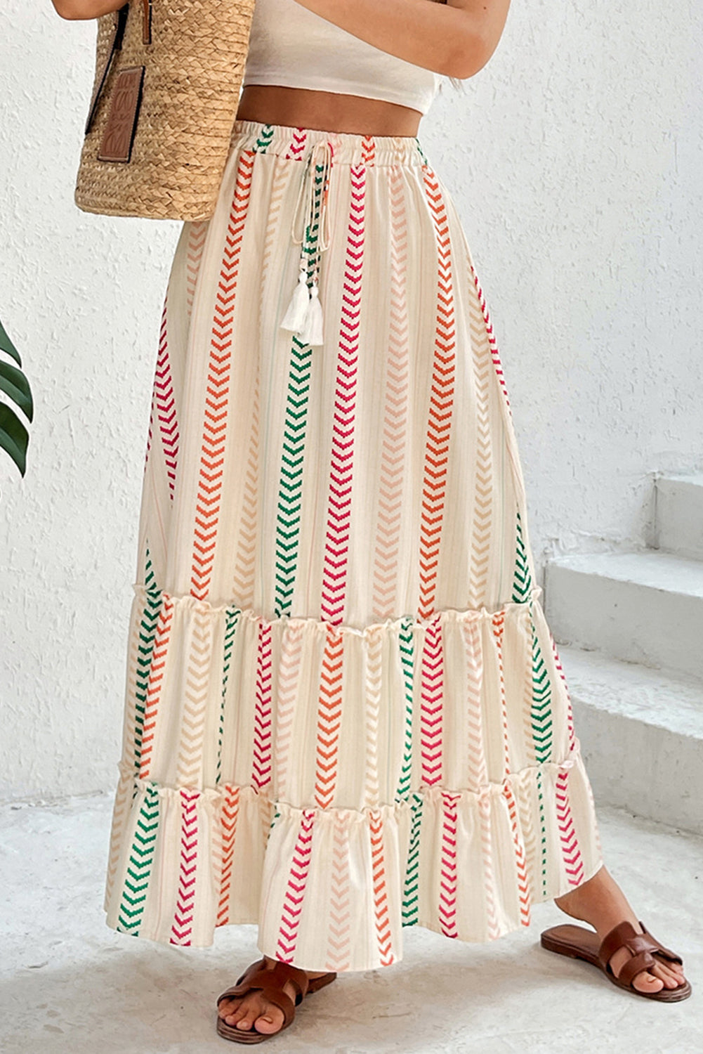 Multicolour Stripe Boho Tassel Tie Waist Tiered Maxi Skirt