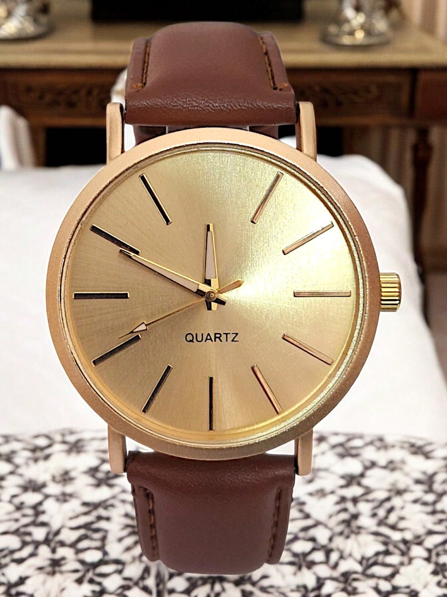 Relógio Masculino Minimalista Social de Quartz Elegante Pulseira de Couro Caixa Dourada Mostrador Dourado Lindo