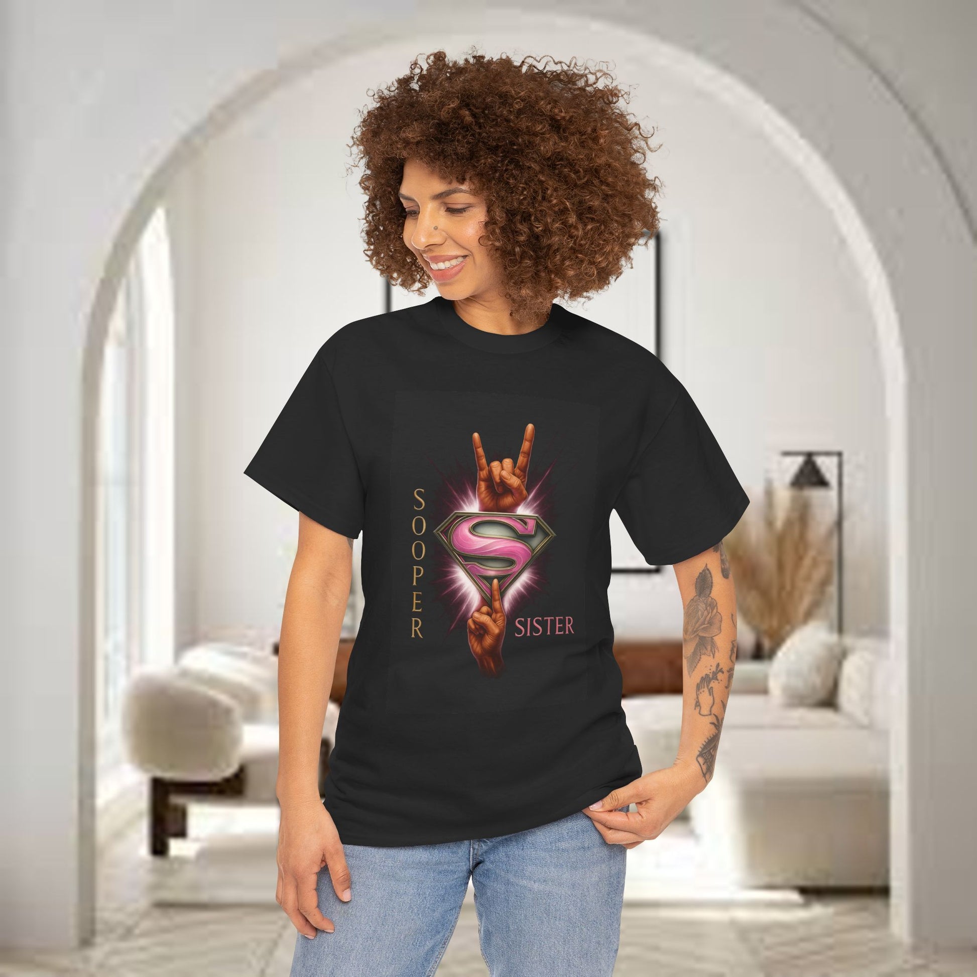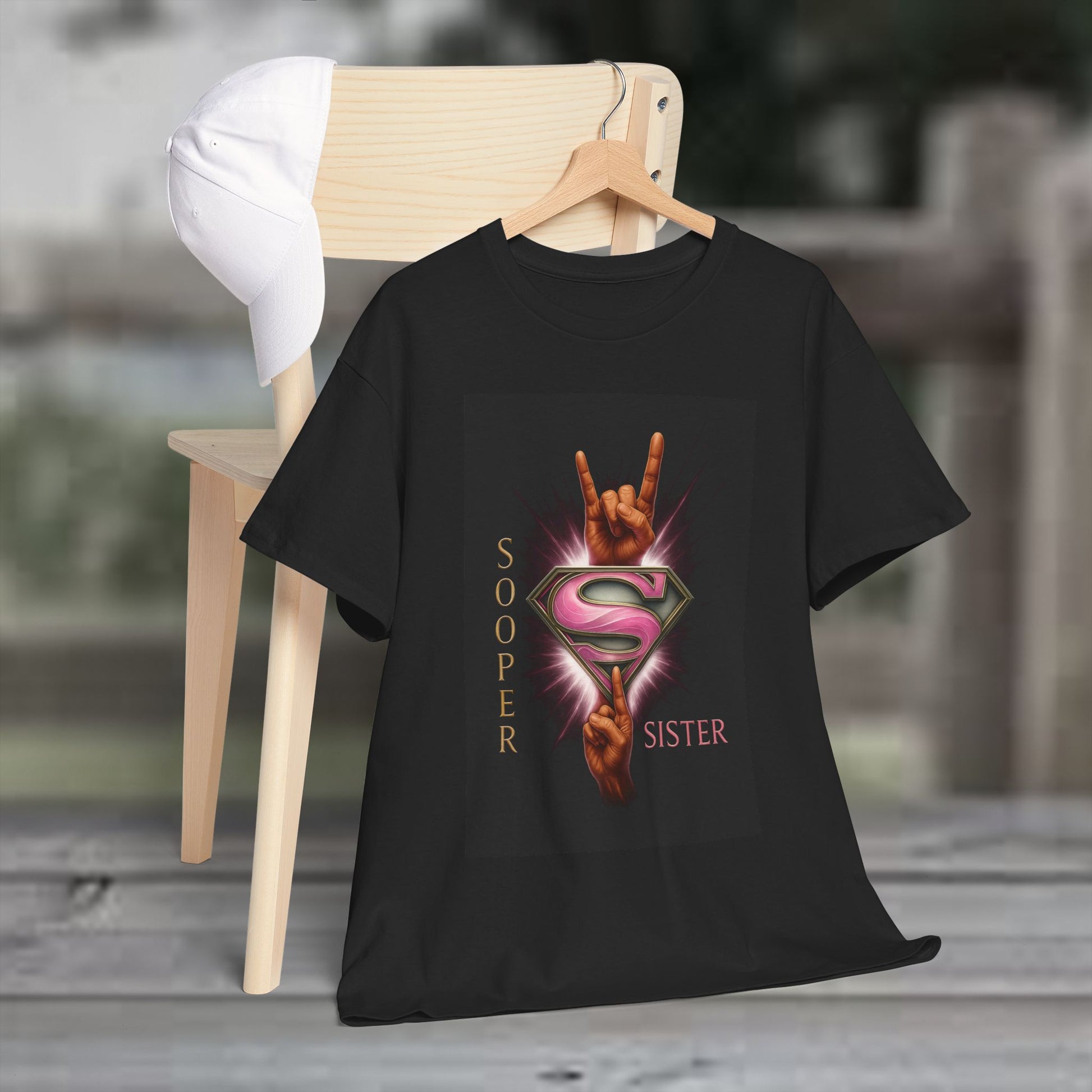 This S0oper Sister tee by PrairieSpirit is the perfect blend of comfort and style. Made with heavy cotton fabric and featuring a ribbed knit collar without seams, this unisex tee offers a classic fit for a relaxed wear. It is ideal for adults looking for a versatile and durable shirt that can be worn on various occasions.