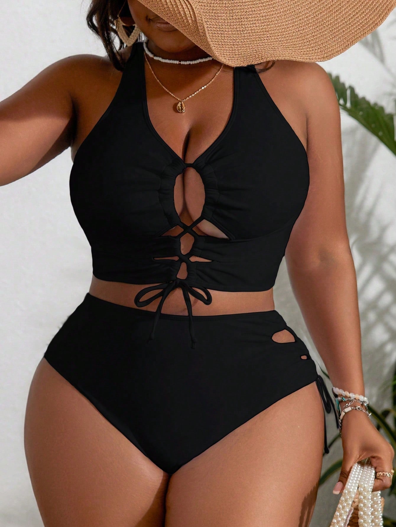 Slayr Plus Size Women's Solid Color Hollow-Out Strap Sexy Bikini Set, Summer Beachwear