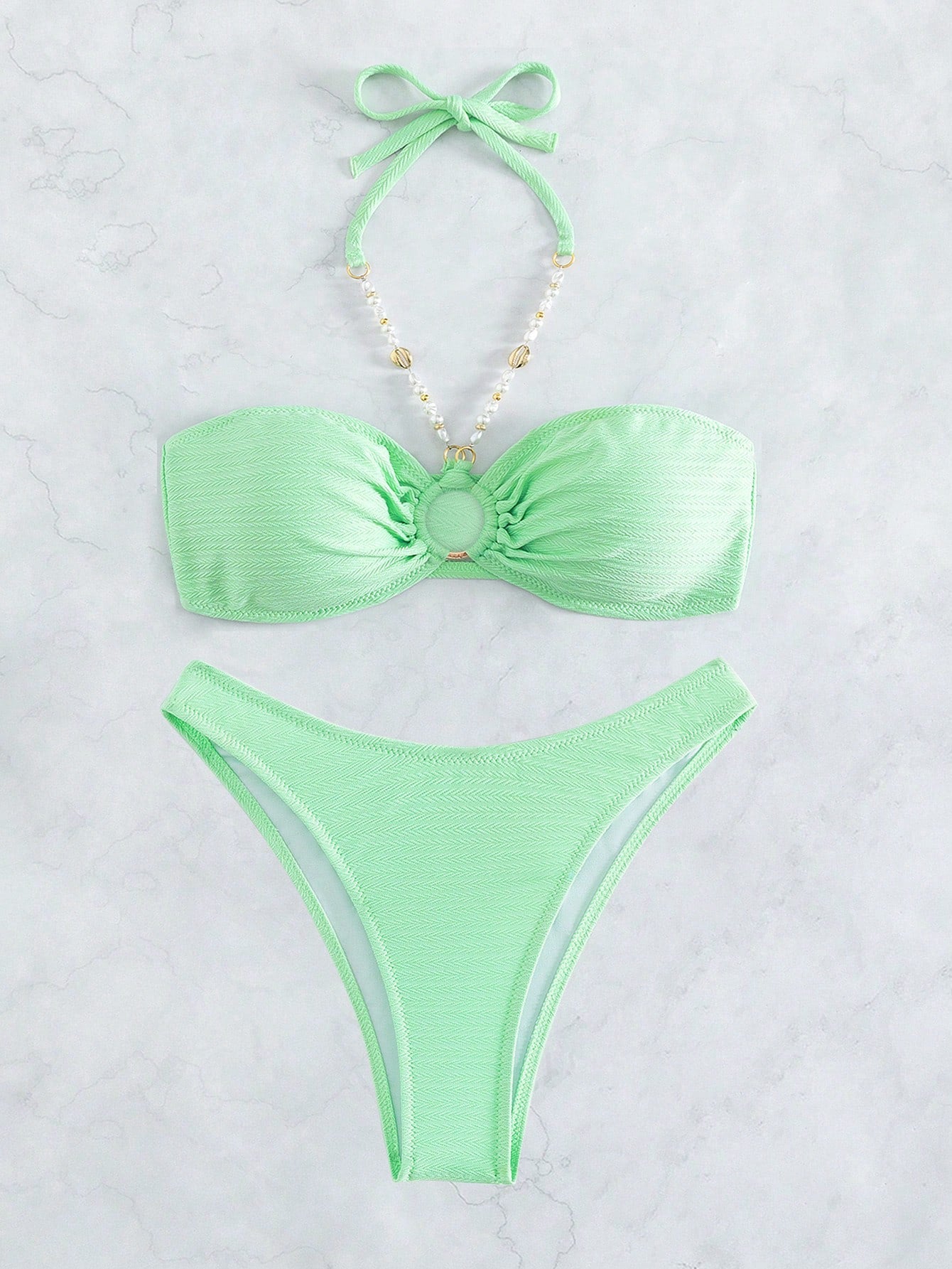 Swim Conjunto de Bikini Halter com Anel Ligado e Busto Franzido para Verão na Praia