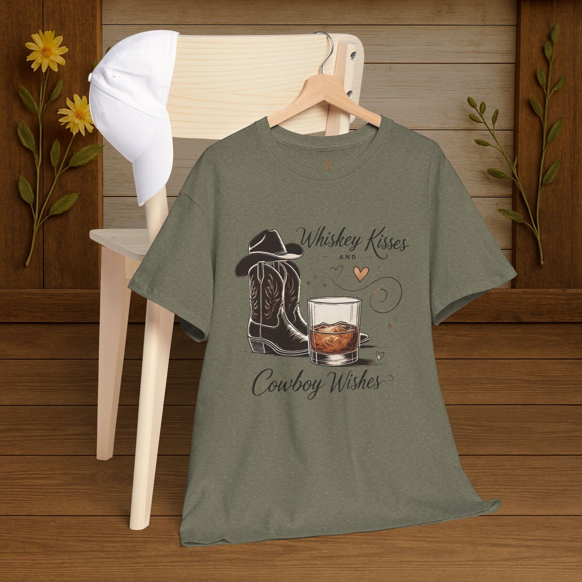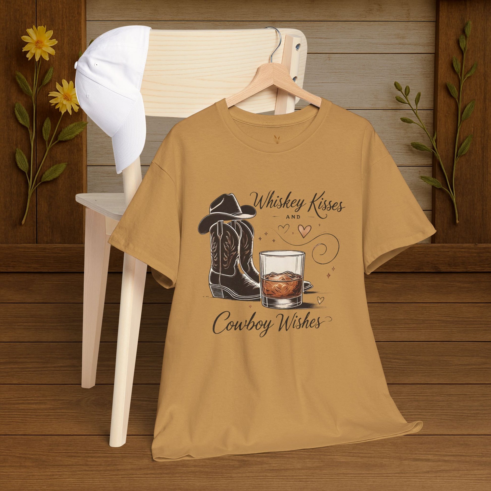 Whiskey Kisses Cowboy Wishes T-Shirt from the PrairieSpirits Designers Collection gives off a rugged and adventurous vibe, perfect for those who love the wild west and country living. This unisex heavy cotton tee is ideal for adults and is made with high-quality, sustainable materials for year-round comfort. The classic fit and crew neckline make it suitable for any occasion, from casual outings to semi-formal events. The tear-away label ensures a scratch-free experience, and it is ethically produced in Nicaragua using dual printing techniques for crisp, detailed designs.