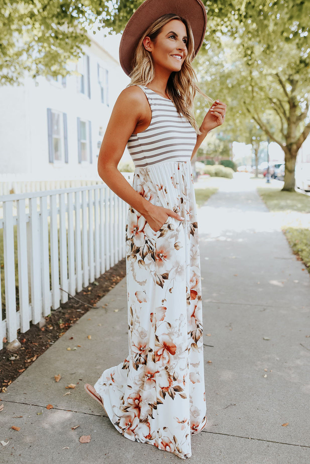 White Boho Stripes & Floral Print Floor Length Tank Dress