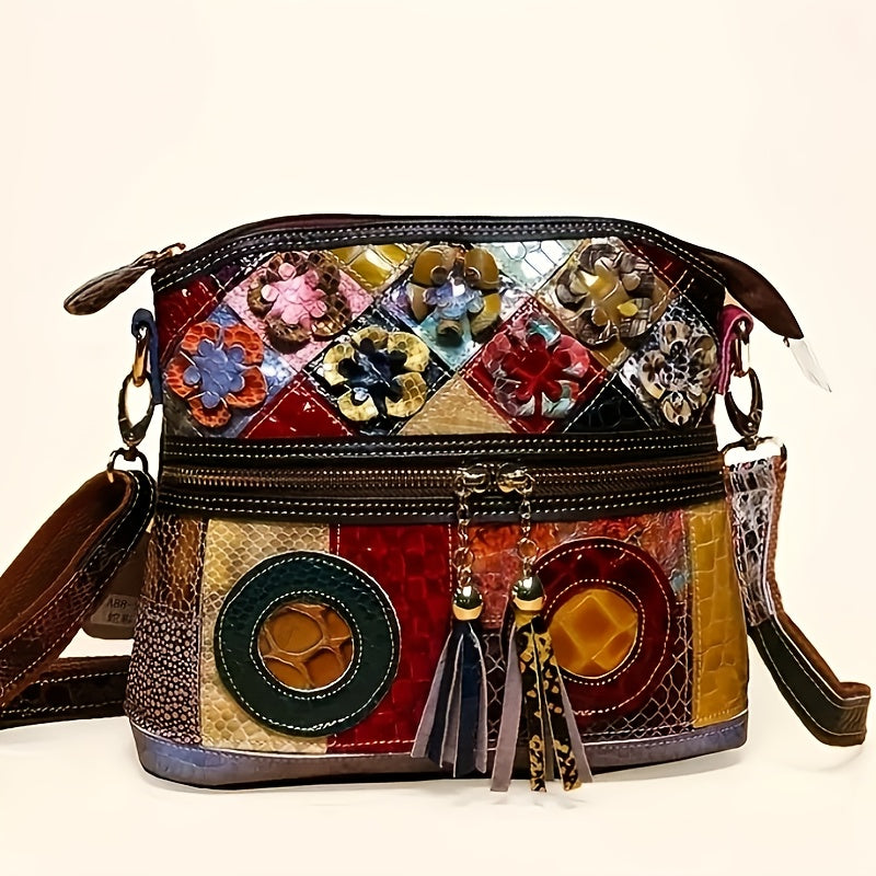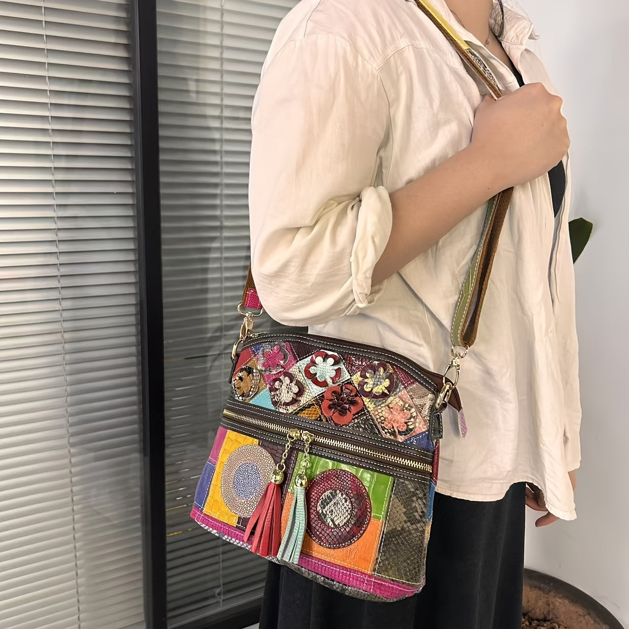Women's Ethnic Style Leather Shoulder Bag with Tassel, Retro Genuine Cowhide Splicing, DIY Design, Random Color, Head Layer, Patchwork